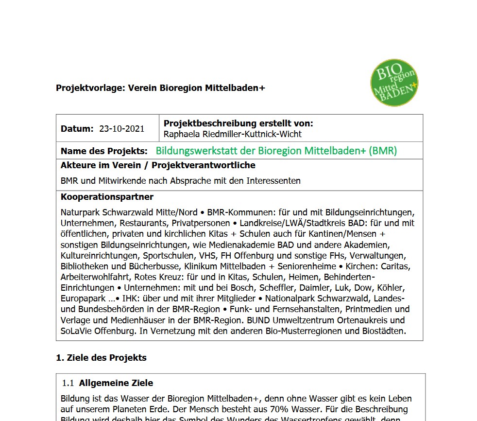 Ziel dieses Projektes ist es, mit dem Informationsangeboten eine Teilhabe bei der Bio-Musterregion Mittelbaden+ zu ermöglichen. Damit wirkt das „Info-Team des Bioregion Mittelbaden+ 2021 e.V. auf Tour“ auch als Modul der Bildungs- und Öffentlichkeitsarbeit des Vereins, das sowohl durch Gesprächsangebote für Kommunen, Unternehmen, Verbände und Vereine, als auch bei Infoständen oder durch Aktionen an Vermarktungsplätzen, auf Märkten und Messen, Hoffesten und Events präsent sein kann. Durch die enge Vernetzung des Info-Teams mit allen Projekt-Werkstätten wird eine zielgruppenorientierte Information über Probleme und Erfolge der Bio-Wertschöpfungsketten ermöglicht, um im Interesse der Ziele der Bioregion Mittelbaden+ davon zu profitieren.