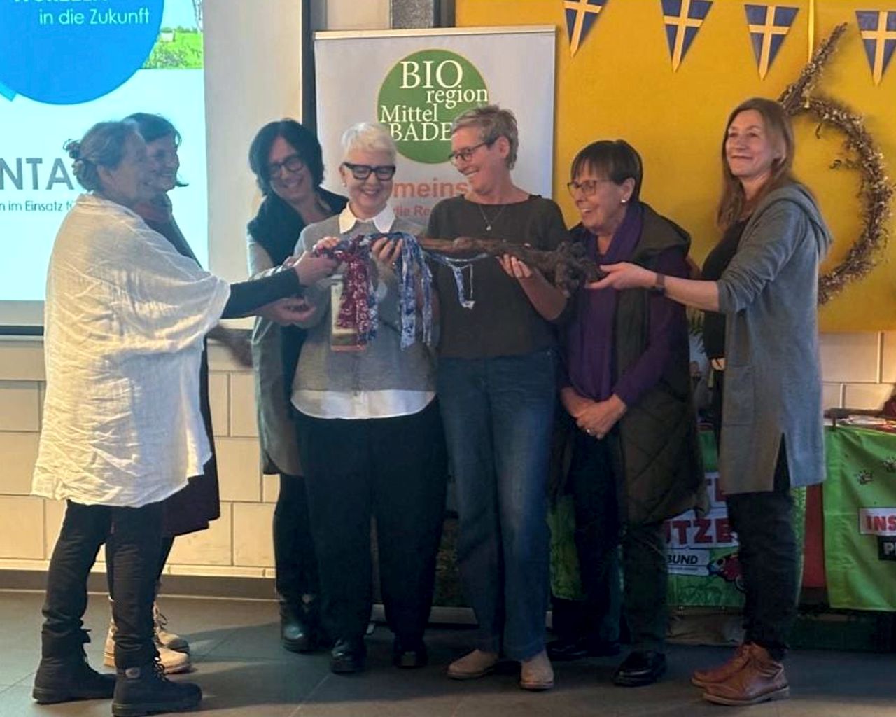 Die Bildungswerkstatt des Vereins BIOregion Mittelbaden+ 2021 e.V. überreichte die begehrte heimische FiBL-Rebholz-Wanderstaffel im Rahmen ihrer Glückstouren zu Schätzen der Bio-Musterregion Mittelbaden+ am 28.11.2025 an Ulrike Claus, Geschäftsführerin von Claus Reformwaren Service Team GmbH.