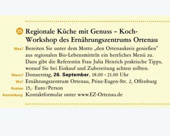 - Ankündigung im BMR-Veranstaltungskalender 2024: Regionale Küche mit Genuss - Koch-Workshop des Ernährungszentrums Ortenau