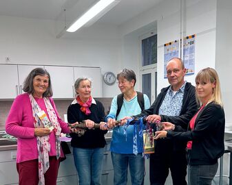 - Foto EZ-Ortenau: 10. FiBL-Wanderstaffel-Überreichung von rechts: Leiterin des Ernährungszentrum Ortenau und Hauswirtschaft Anja Jäkle, Leiter des LWA Ortenau Arno Zürcher, Glückstourteilnehmerin Brigitte Auth, die Organisatorinnen Raphaela Riedmiller-Kuttnick-Wicht und Walburga Dinger