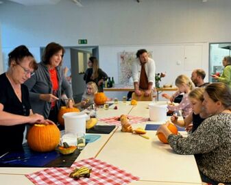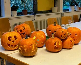 Nach kommunikativer Kaffee- und Teepause beteiligten wir uns am familienfreundlichen Angebot Kürbisschnitzen der "Initiativgruppe Gemeinsam Leben im Seidenfaden" im Stadtteil- und Familienzentrum Oststadt, das sich auch dieses Jahr wieder über großes Interesse freuen konnte.