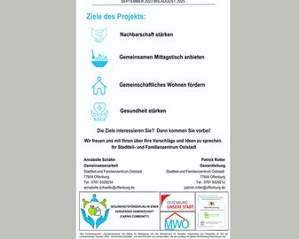 Der Mittagstisch findet im Rahmen des Projekts „Gesundheitsförderung in einer sorgenden Gemeinschaft (Caring Community)“ statt, welches derzeit im Rahmen der Gemeinwesenarbeit vom Stadtteil- und Familienzentrum Oststadt gemeinsam mit dem zivilgesellschaftlichen Partner „Mehrgenerationen-Wohnprojekt Offenburg e.V.“ durchgeführt wird. Das Projekt zielt auf ein gutes Zusammenleben der Generationen und auf gesundheitsfördernde Strukturen in einer unterstützenden Nachbarschaft ab. Im Fokus steht hierbei gesundheitsfördernde Strukturen zu schaffen, um ein möglichst langes, gesundes Leben in den eigenen vier Wänden zu ermöglichen. Konkrete Ziele sind den Ausbau des regelmäßigen Mittagstischs im Stadtteil- und Familienzentrum Oststadt, die Stärkung der Nachbarschaft, die Förderung gemeinschaftlichen Wohnens sowie die Stärkung der Gesundheit. Das Projekt wird finanziert über das Förderprogramm „Quartiersimpulse“ der Allianz für Beteiligung und des Ministeriums für Soziales, Gesundheit und Integration. Das Förderprogramm ist Teil der Landesstrategie „Quartier 2030- Gemeinsam.Gestalten“ und wird finanziert aus Landesmitteln, die der Landtag Baden-Württemberg beschlossen hat. Für Fragen zum Projekt steht die Gemeinwesenarbeiterin Annabelle Jakob unter annabelle.jakob@offenburg.de zur Verfügung.