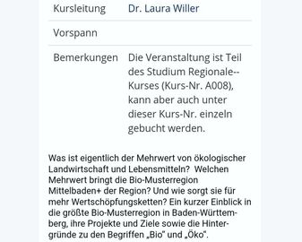 Die 16. FiBL-Wanderstaffel-Auszeichnung (Hintergrund) an die Volkshochschule Baden-Baden fand anlässlich des Studium Regionale-Kurses: „MehrWert in der Bio-Musterregion Mittelbaden+“ statt. Dr. Laura Willer, Regionalmanagerin der Bio-Musterregion Mittelbaden+ gab einen gelungenen Einblick in die größte Bio-Musterregion in Baden-Württemberg, ihre Projekte und Ziele sowie die Hintergründe zu den Begriffen „Bio“ und „Öko“. Der Kurs des Studium Regionale der VHS BAD ermöglichte den Teilnehmer:innen, denen Großteils bisher die Bio-Musterregionen unbekannt waren, Verständnis zu "Was ist eigentlich der Mehrwert ökologischer Landwirtschaft und Lebensmitteln, welchen Mehrwert bringt die Bio-Musterregion Mittelbaden+ der Region und wie sorgt sie für mehr Wertschöpfungsketten?