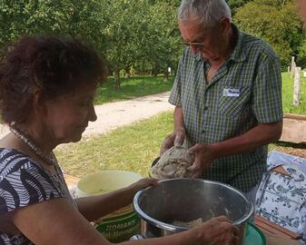 Foto: Brotteig, Profi Thomas sorgt für leckeren Teig mit Zeller-Mühlen-Mehl und richtige Backhitze im Ofen, Eva hilft ein bisschen