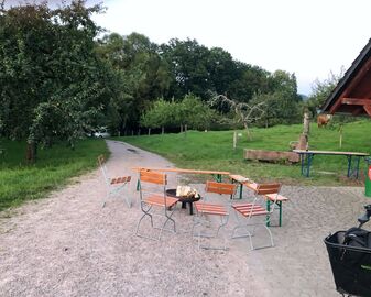 Das naturnahe Übernachtungsangebot auf gemeinnützig betreuten städtischen Streuobstwiesen im Wasserschutzgebiet war die vierte der geplanten Glückstouren zu regionalen Schätzen, die von der Bildungswerkstatt zur Unterstützung der Bio-Musterregion Mittelbaden+ organisiert werden. Die Wandergruppe war nach Start am Bahnhof Baden-Baden im beschaulichen Cafe' Lumen im Lichtentaler Klosterhof eingekehrt, bevor sie zur 4. FiBL-Wander-Staffelüberreichung zum Obstgut Leisberg aufbrachen und dort von Waltraud Nölle und Thomas herzlich empfangen wurden (Hintergrund).