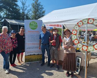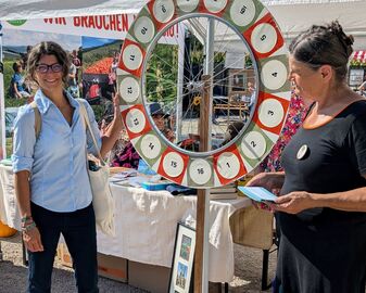 Eva Zehe hatte zusammen mit Raphaela Riedmiller-Kuttnick-Wicht währenddessen das Glücksrad, Preise und Infomaterial vor Ort gebracht und den Infostand der Bildungswerkstatt, die auch die "Glückstouren zu Schätzen der Bio-Musterregion Mittelbaden+" organisiert für den späteren Einsatz vorbereitet.