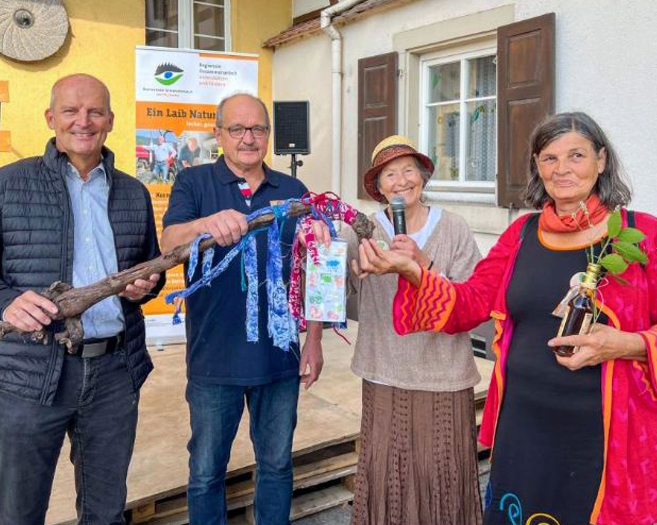Foto 24-09-21 NP-Auszeichnung: Geehrt als Naturparkpartner Thomas Huber. Links Bürgermeister Jürgen Pfetzer, rechts Christina Cammerer